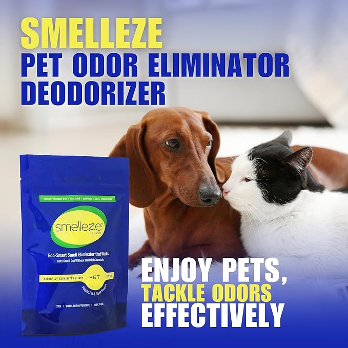 - REFRESH YOUR ENVIRONMENT WITH SMELLEZE: Banish animal waste smells effortlessly with SMELLEZE Smell Removal Deodorizer. This powerful deodorizer powder acts as a refresher for your home, eliminating pet odors with ease. Simply sprinkle on areas with offensive odors, and watch as SMELLEZE draws in and absorbs urine, fecal, ammonia, and other waste odors. Unlike other products, it doesn't just mask smells; it eradicates them, leaving your space truly fresh.