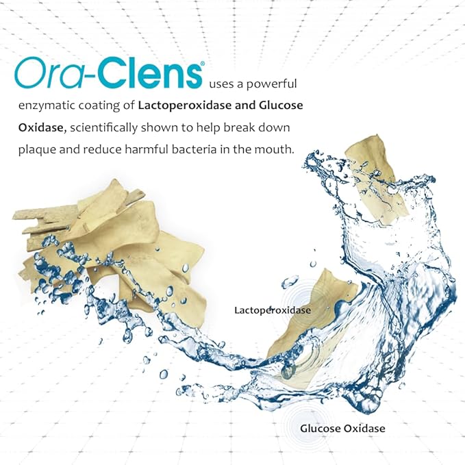 - Effective Cleaning: Ora-clens Oral Hygiene Chews formula features a blend of the enzymes Lactoperoxidase and Glucose Oxidase, which help prevent plaque and tartar build up as well as promote clean teeth and fresh breath. With the enzymes coated onto the chews, your dog will gain benefits faster. Oral Hygiene Chews also feature an abrasive texture, which help scrub your dog's teeth while they chew.