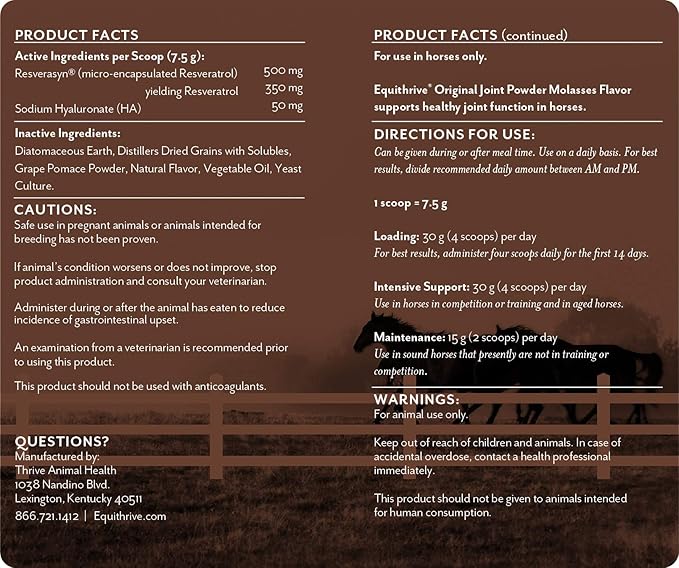 • SUPPORTS SOUNDNESS - Equithrive Original Joint Powder Molasses Flavor, fortified with Resveratrol and Hyaluronic Acid, supports soundness and mobility in horses. This joint supplement for horses is designed to support joints during training, competition and aging.