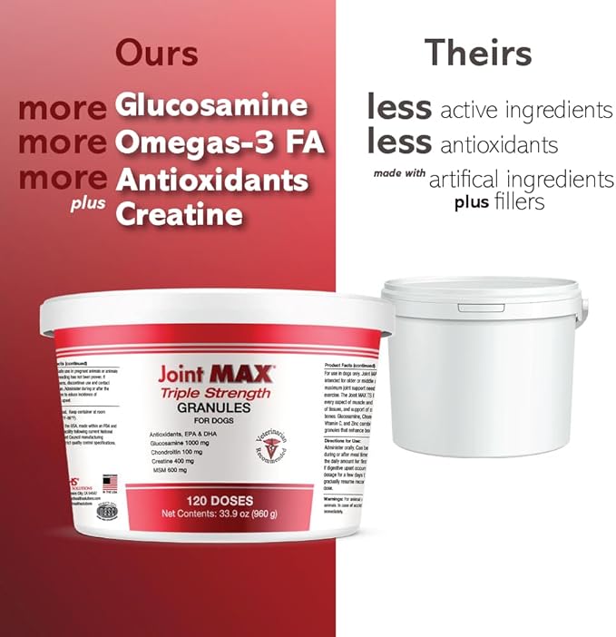 - RELIEF FROM INFLAMMATION - For active dogs or once active dogs that still love to play, Joint MAX Triple Strength uses natural turmeric root to reduce inflammation and relieve joint pain. Your pet will finally rest comfortably after a rough day at the dog park with our super joint enhancer.