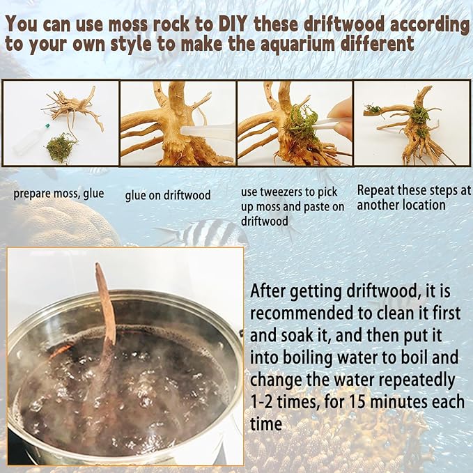 • ✔EASY TO CLEAN --- Unlike live plants, the low maintenance fake decor requires no oxygen or fertilizer.Boiling in water for 1 hours with soda or salt ,the water color will become dark. Boiling the driftwood with water again ( recommended 3 times, 20 minutes each time ) until the tannins totally releases.