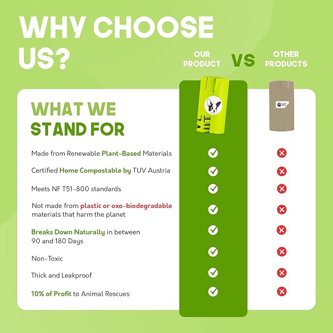 - 100% HOME COMPOSTABLE DOG POOP BAGS - Our unscented poop bags for dogs are ethically sourced and carefully manufactured from 100% botanical plant components. We use only Cornstarch, BPAT (compostable polymer), and edible glycerin in the nature-based creation of our doggie poop bags. All our products are TÜV AUSTRIA Home Compost Certified to be of ASTM D6400, EN 13432 and NF T51-800 standards!