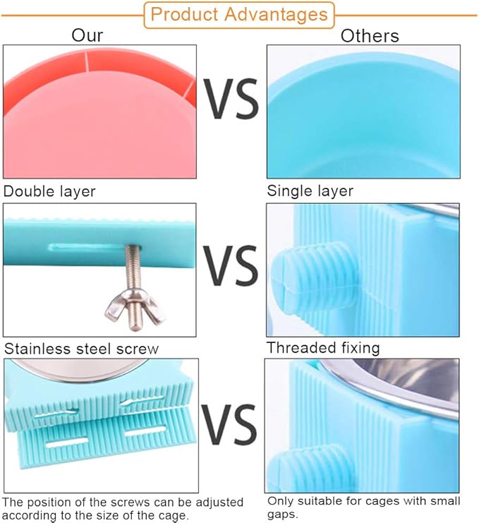 • Hanging Cage Design: The corrugated design locks the cage bars securely and is not easy to fall off. Removable stainless steel inner bowl with smooth surface, easy to clean.