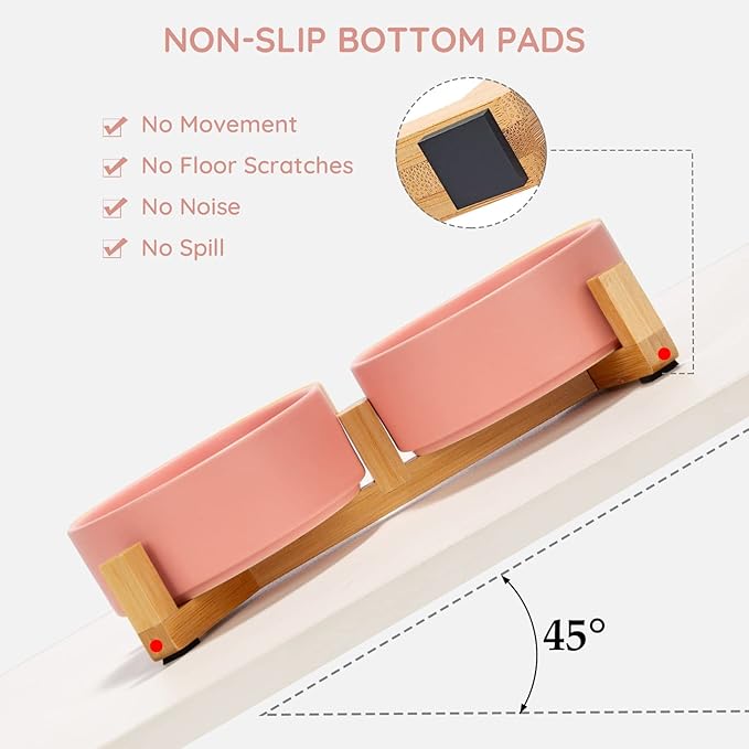 • Double Bowl Design:One dog bowl for food and one for water, Each ceramic cat bowl has a Unique wooden stand, raising the dishes closer to your pet for more comfortable eating