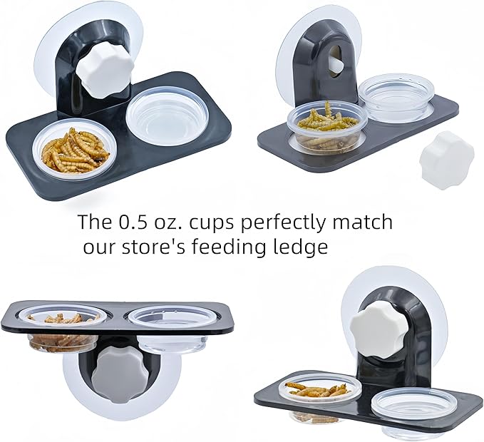 - FIT OUR FEEDING LEDGE: These cups are professionally made to order, Optimized and improved many times, and are perfect for our store's feeding ledges, fit together perfectly. This set contains 100 Terrarium Bowls, for feeding feed and water for small animals. There are enough feeding cups in the set for you to change at any time, so you don't have to worry about cleaning