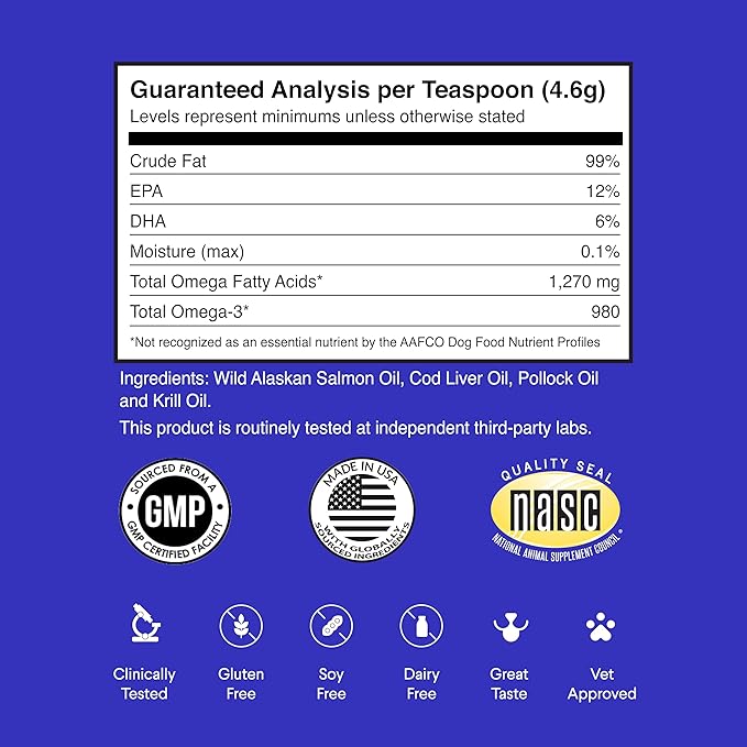 - OMEGA 3 FROM WILD CAUGHT ALASKAN SALMON, KRILL AND COD OIL FOR DOGS - 100% SATISFACTION GUARANTEED: Our Fish Oil liquid for dogs are Made in USA in a GMP Certified Facility with global ingredients to help ensure you get the best fish oil formula for your dog. All orders of omega max liquid supplement for dogs are backed by a 365 Day Satisfaction Guarantee. Wonder Paws is a member of the prestigious National Animal Supplement Council which ensures strict quality control standards.