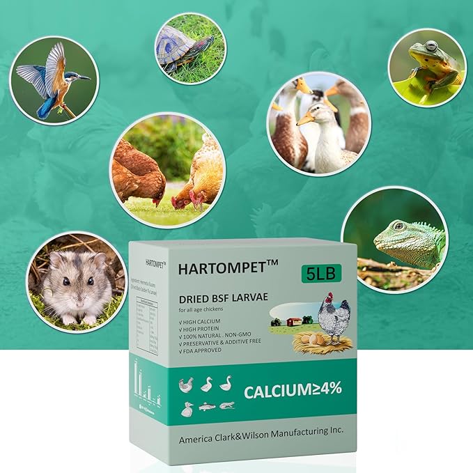 - Essential Nutrients: HARTOMPET contains 85x more calcium than mealworms, 40-45% crude protein, 26-31% healthy crude fat, 16% essential amino acids, phosphorus, fiber, and lysine, promoting healthy feather production and stronger eggshells.