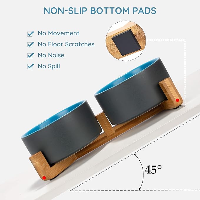 SPUNKYJUNKY Ceramic Dog and Cat Bowl Set with Wooden Stand, Modern Cute Weighted Food Water Set for Small Size Dogs (13.5OZ) & Medium Sized Dogs (28.7OZ) & Cats (3.6 Cups, 2 × Blue-Grey)