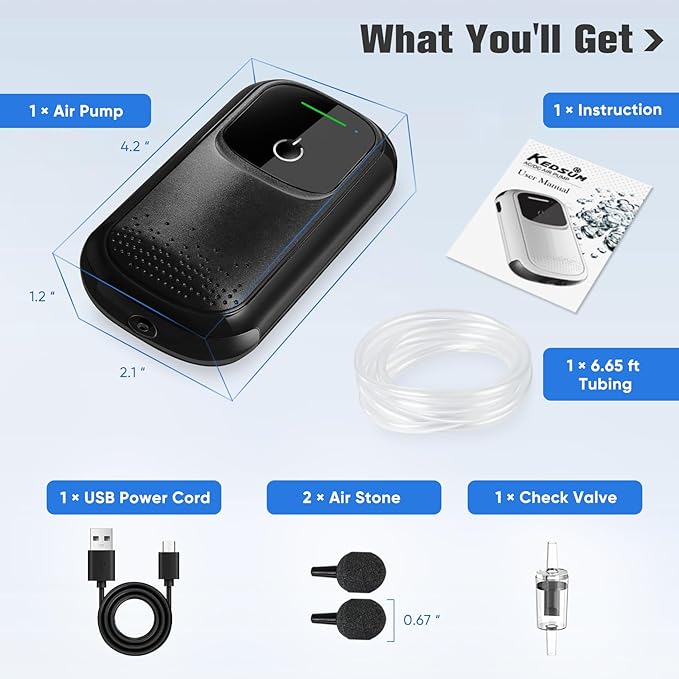 - Package Include: Come with complete accessories, Air Tubing x 1( 6FT); Air Stone x 2; Check Valve x 1; Type-C Cable x 1