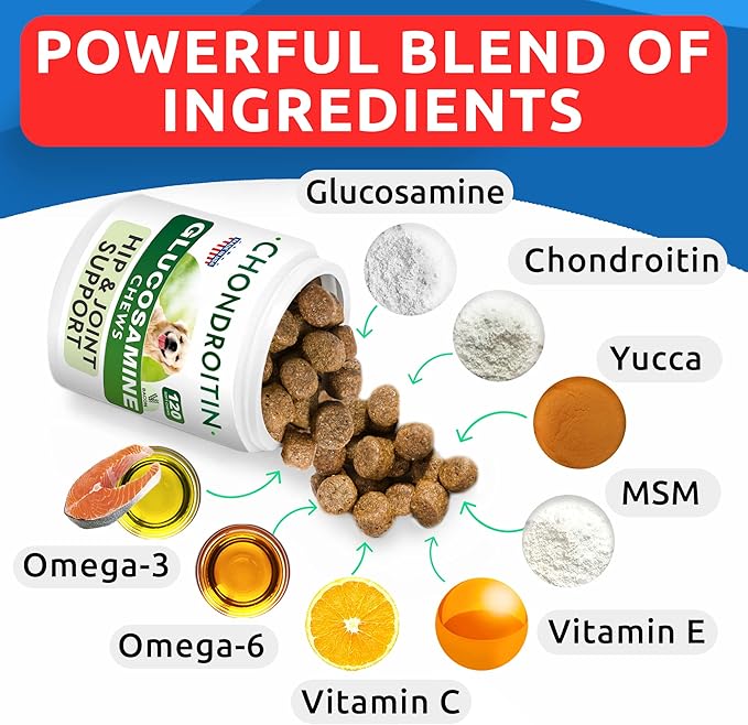 - Vet-Approved Formula: With glucosamine, chondroitin, MSM sulfate & Omega-3-6, our dog hip and joint supplement is the best natural support for your buddy's mobility. Plus, these bites extend the benefits to your pup's flexibility and comfort.