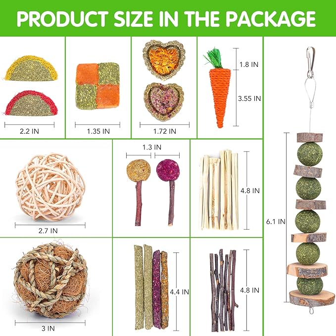 - ALL NATURAL MATERIALS: The products in the pet toy set are made of 100% natural materials. High quality apple wood, sweet bamboo and timothy hay products can be chewed. Natural woven balls for rabbits to chew and play with. Grass balls and cakes are rich in nutrients, which can help improve digestion and increase appetite. The taste of rose and calendula brings a variety of tastes to small pets.