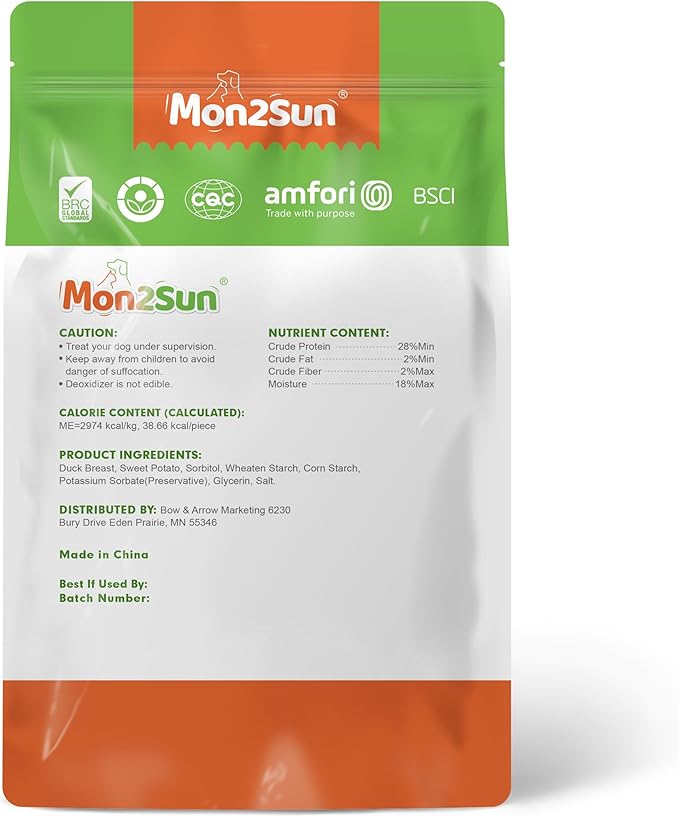 • [Safe Ingredients] MON2SUN dog treats are majorly made of duck and sweet potato. Each ingredient undergoes rigorous inspection to ensure the utmost safety for your furry family member.