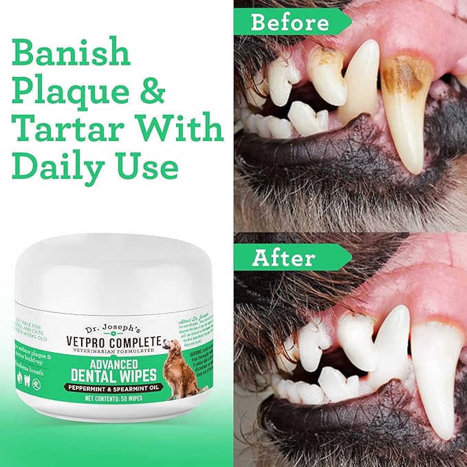 VetPro Complete Dr. Joseph's Advanced Dog Dental Wipes, 50 Count, Easy Teeth Cleaner for Dogs and Cats with Peppermint and Spearmint, Freshens Breath, Reduces Tartar