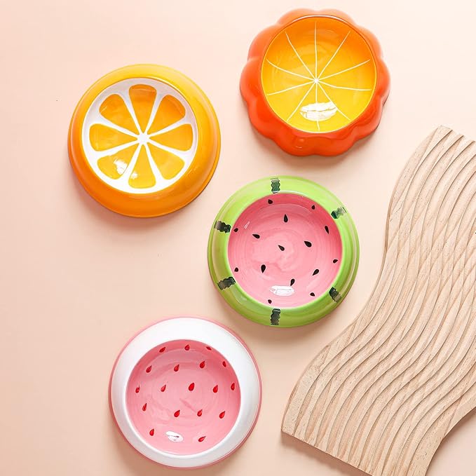 - Multicolor Cat Bowls: These cat food bowls are glazed internally with contrasting colors and finished with different pattern (Strawberry, grapefruit, orange, watermelon). They are bold, bright and refreshing, add a pop of beauty to your home and look like works of art on display. Chic and stylish cat plate looks pretty in any household.