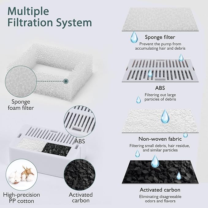 • The cupcake cat fountain features a dual filtration system: a replaceable charcoal filter removes dirt and food particles, and a pre-filter sponge designed to catch hair and debris. This system ensures that your beloved pets have access to fresh, clean water.