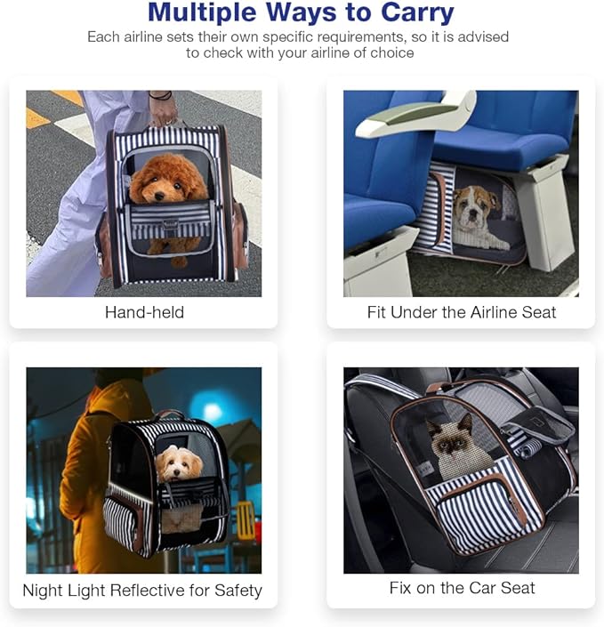 - EXPANDABLE & COLLAPSIBLE: This pet carrier backpack with an expandable back allows your pet to move around more comfortably and reduces the anxiety. And the carrier can collapse flat when not in use. Measures 14.17x12.59x17.32 inch, easily fits most small/medium-sized pets, weighing up to 18 lbs. Each airline sets their own specific requirements, so it is advised to check with your airline of choice