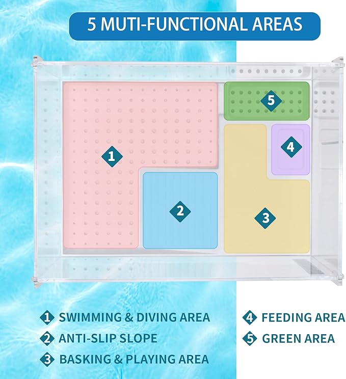- 【Multi-Functional & Scratch-Resistant Design】This turtle tank features 5 durable anti-scratch zones: basking platform, feeding area, anti-slip zone, removable planter, and swimming space. Thick acrylic walls prevent scratches from claws while keeping land/water areas separated.