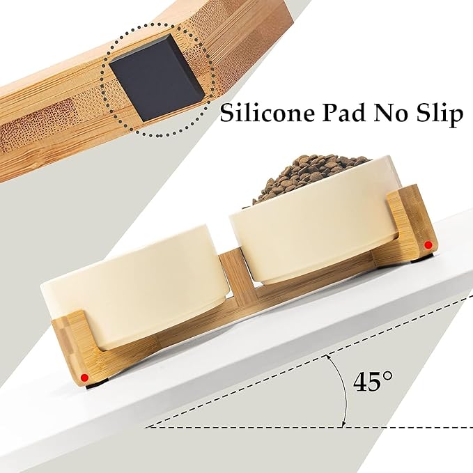 • [Double Bowl Design]:One dog bowl for food and one for water, Each ceramic cat bowl has a Unique wooden stand, raising the dishes closer to your pet for more comfortable eating