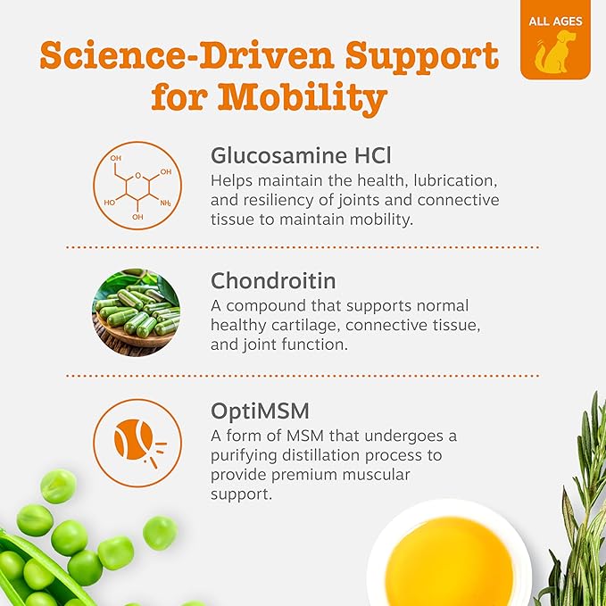 • GLUCOSAMINE HYDROCHLORIDE FLEXIBILITY: This dog glucosamine and chondroitin supplement helps maintain joint health, lubrication, and resilience for an active lifestyle