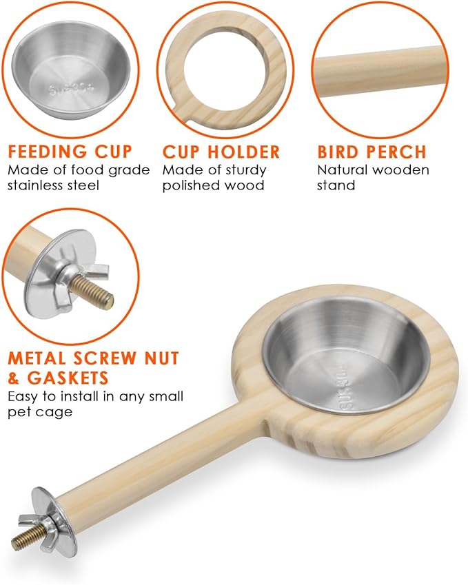 KATUMO Bird Perch Bird Feeding Cup Parrot Wood Perch Stand Toy Bird Cage Accessory for Parakeet Lovebird Conure Budgie Canary Finch Small Parrots