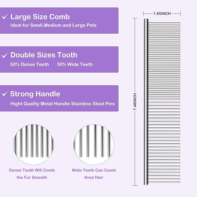 - STAINLESS STEEL COMB 2-IN-1 DESIGN - Sparse teeth to loosen tangled hair & comb large fluffy hair, also can be styled for dogs; dense teeth to comb eyes ears, nose & fine hair on legs; rounded pins with smooth stainless steel to effectively prevent static electricity & tangled hair when combing.
