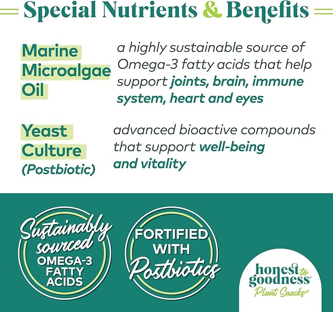 • SPECIAL NUTRIENTS – Our snacks are also infused with Marine Microalgae Oil, a highly sustainable source of Omega 3s, and Yeast Culture (Postbiotic), which contains advanced bioactive compounds that support well-being and vitality.