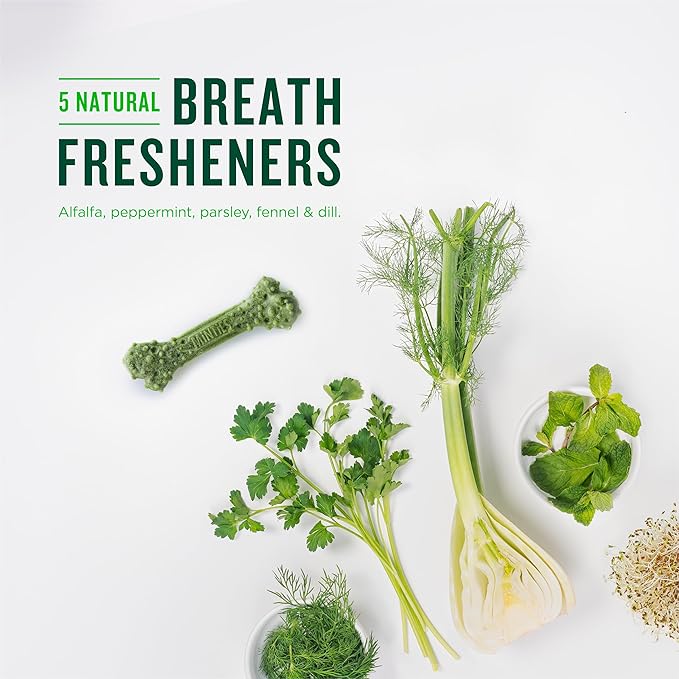 • FRESHENS BREATH: Minties dental treats for dogs contains NO WHEAT, CORN, OR SOY. These dog breath treats contain five (5) breath fresheners alfalfa, parsley, fennel dill, and peppermint.