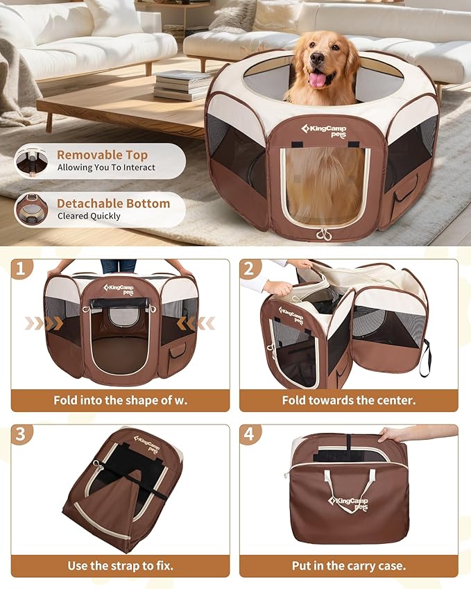 KingCamp Dog Playpen, Portable Foldable Cat Kitten Puppy Tent Crates 29"/36"/50" Pop Up Pet Playpen with Zippered Bottom & Cover for Indoor Outdoor Use (Medium, Khaki)