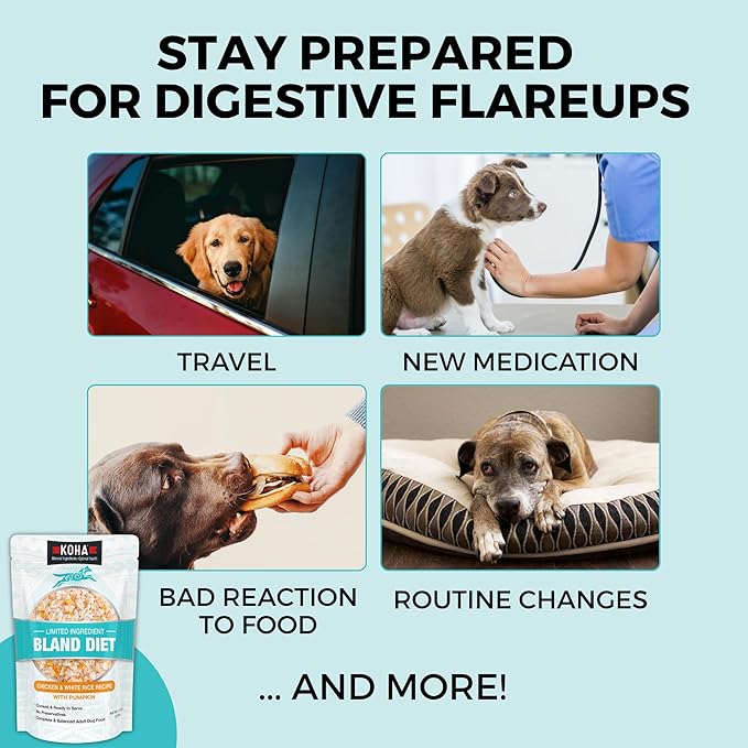 • FOR CHRONIC UPSET STOMACH OR FLAREUPS: Whether your dog suffers from chronic digestive issues, or is experiencing a flareup from things like stress, medication, or travel, KOHA Bland Diet can be fed to help get their tummy back on track!