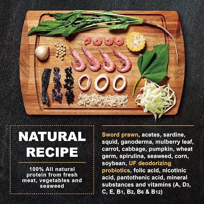 • High Palatability : Sword Prawn Flavor - A blend of wild sword prawns, akiami paste shrimp, vegetables and seaweed. A perfect 6:4 meat/vegetable protein ratio