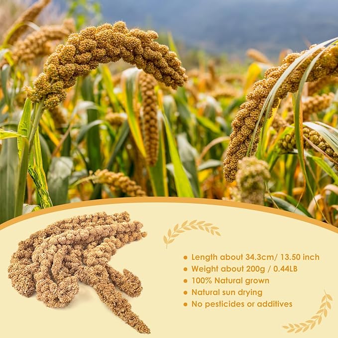 • PERFECT FOR ALL BIRDS: Parrot millet food is a popular and nutritious seed, each natural grown length is about 34cm/13inch, and approx. 0.44lb/7oz in total weight, suitable for kinds of bird species, like canary, budgie, parakeet, conure, lovebird, cockatiel and finches. Besides, millet spray is also a favorite food for hamster, chinchilla and more rodent pets
