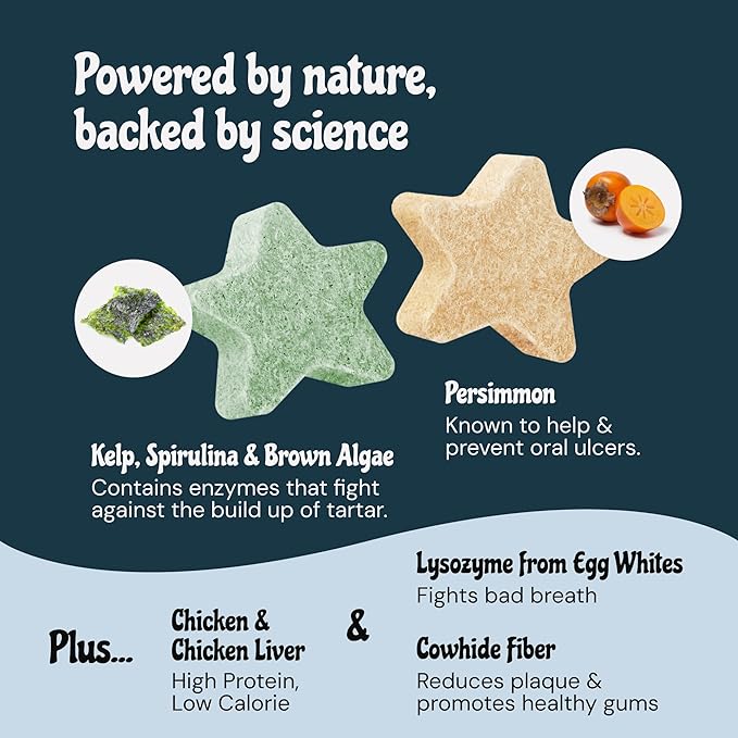 - Freeze Dried Dog Dental Chews: Dive into flavor with our seaweed and persimmon dog breath chews. Loaded with 50% protein and just 9 calories per star, these teeth cleaning dog treats are packed with chicken, persimmon, kelp, brown algae, and spirulina for a vitamin-rich treat