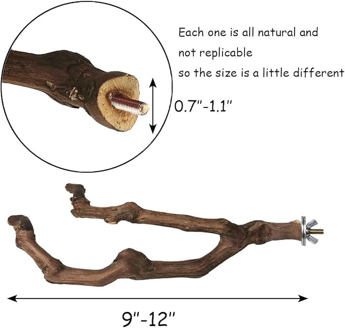 • [NATURAL GRAPEVINE] Each of our bird perches is made from natural, wild grapevines, providing pets with a natural and safe standing wood.Due to its natural material, each perch is unique, and is not exactly the same shape or size