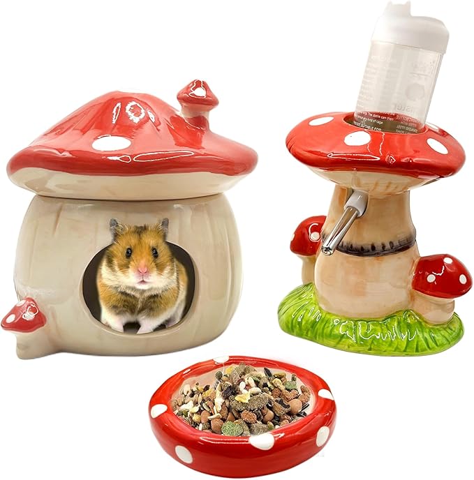 • Versatile Accessories: Includes a ceramic mushroom hideout, water bottle with stand, food bowl, and other essential supplies for your hamster's habitat.