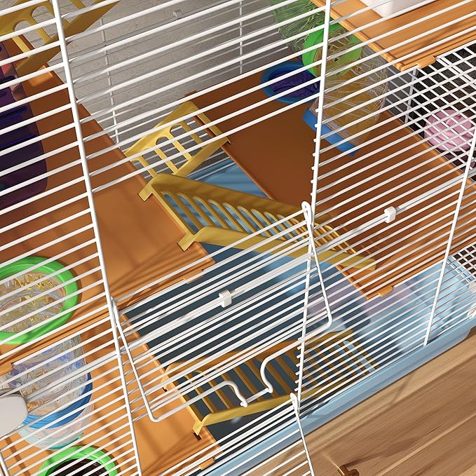 - 5-Tier Design: Featuring toys galore, the hamster habitat contains tunneling, a wheel, ramps, and a hut. Spot your little guy mid-tube, mid-ladder, or catching a drink of water after the fun. This fun hamster cage provides not only a multi-story design but activities to enjoy.