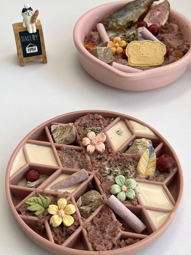 • Size: 15x15x2.5cm, suitable for puppy, cats or kitty and small sized dogs. It is great for both dry and wet food(yogurt, peanut butter, raw food, canned food etc.), can hold up to 1/4 cup/60g/2oz of dog food.