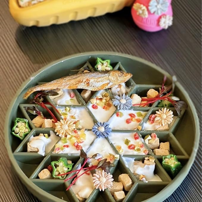 • Size: 15x15x2.5cm, suitable for puppy, cats or kitty and small sized dogs. It is great for both dry and wet food(yogurt, peanut butter, raw food, canned food etc.), can hold up to 1/4 cup/60g/2oz of dog food.