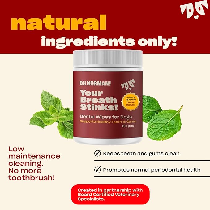 OH NORMAN! Dog Dental Wipes - Vet-Approved Pet Dental Finger Wipes for Oral Hygiene & Fresh Breath - Alternative to Finger Toothbrush for Dogs - No Fuss Dog Cleaning Supplies for Daily Use - 50 pcs