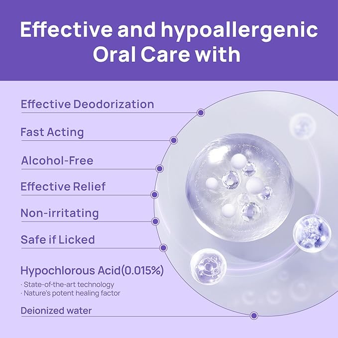 - Effectively Fights Bad Breath at the Source: The active ingredient of our dog teeth cleaning spray is Hypochlorous Acid (HOCI)—a naturally occurring substance agent in pets' immune systems—that rapidly eliminates odor-causing harmful organism at the source. Unlike ordinary pet fresheners that merely mask odors, this product achieves long-lasting oral freshness and health maintenance by disrupting harmful organism protein structures and directly decomposing odor molecules.