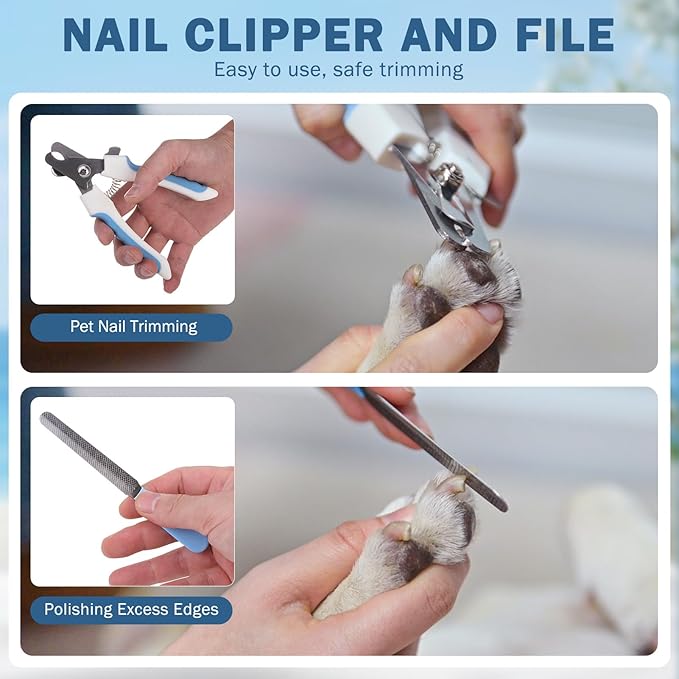 - PET NAIL TRIMMING KIT: Sturdy stainless steel and sharp edges make it easy to trim your pet's thick nails, and the safety guard is designed to prevent over-trimming and damage to the blood edge of the nail. After clipping, use the included nail file to polish your dog's toenails to make them rounded and less scratchy