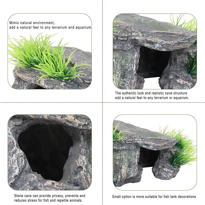 - MULTI-FUNCTIONAL: The fish tank accessories ideal for for SMALL reptiles, amphibians, and fish. Such as glo fish, betta, bearded dragon, leopard gecko, turtle, ball python, snake, tortoise, scorpion, hermit crab, frog, wild or pet toads ect. Create a stimulating environment. Perfect for terrarium decor or fish tank rocks and gecko tank accessories or tortoise habitat accessories. it offers a secure and comfortable reptile hide.