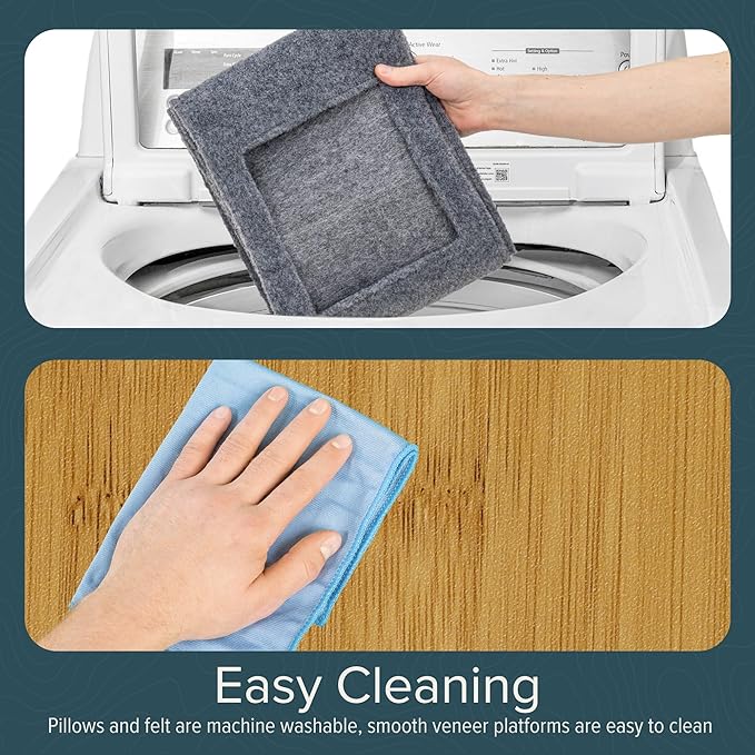 - EASY TO ASSEMBLE AND CLEAN - Quickly assemble the tree with step-by-step diagramed instructions, and scan the included QR code to watch an instructional video for a helping paw. To clean, machine wash the removable felt and cushions, and wipe the veneer with a damp cloth.