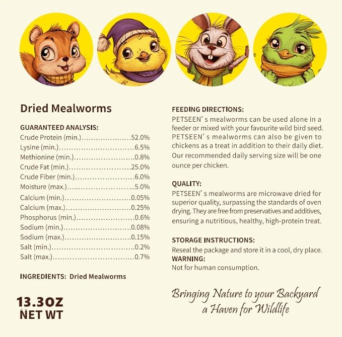 • High Protein: These dried mealworms offer a protein-rich 54% protein content, making them an excellent nutritious snack or pet food supplement.