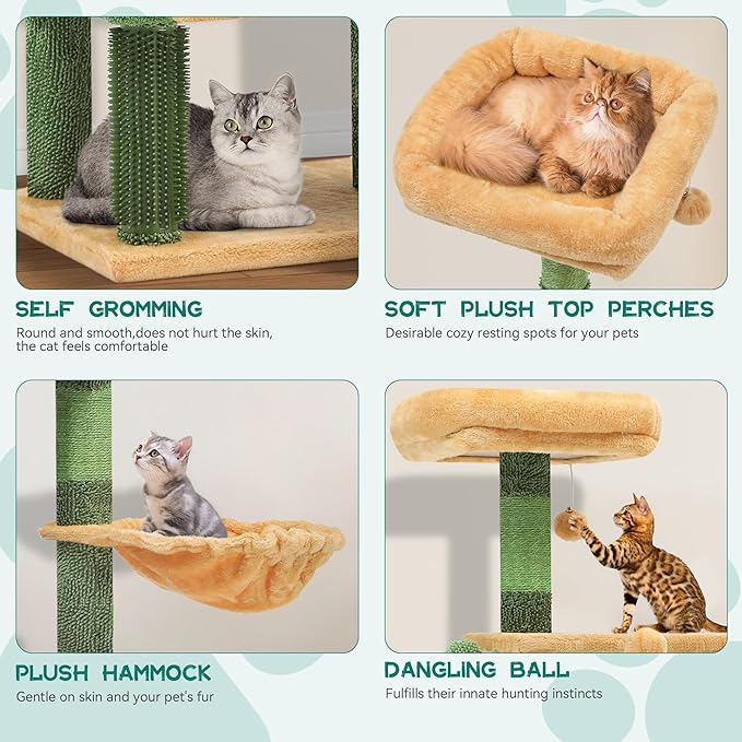 YITAHOME 44.5in Tall Cactus Cat Tree Tower with Self-Grooming Brush, Cute Cat Climbing Tower for Indoor Cats with Cat Condo, Plush Platform, Hammock, Sisal Scratching Posts, Dangling Ball