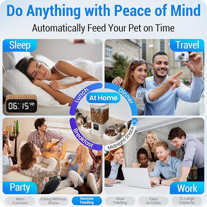 - Remote APP Control : Manage your pet’s meals from anywhere with the “Smart Life” app (iOS/Android). You can set up a feeding schedule of up to 30 meals per day, with 1-12 portions per meal. Reward your furry friend remotely with on-demand feeding, check detailed feeding history, and share access with family members—perfect for busy households or travel.