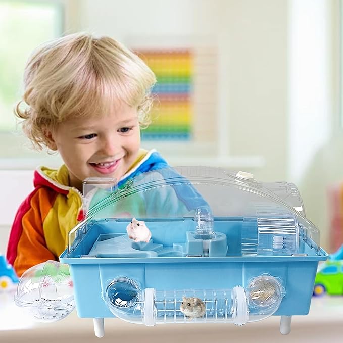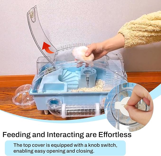- 【Transparent Field of View】 The hamster cage features a top made of acrylic material, allowing you to easily observe your furry friend as they eat, play, rest, and grow. The convenient top door of this dwarf hamster cage enables interaction and bonding moments with your hamster.