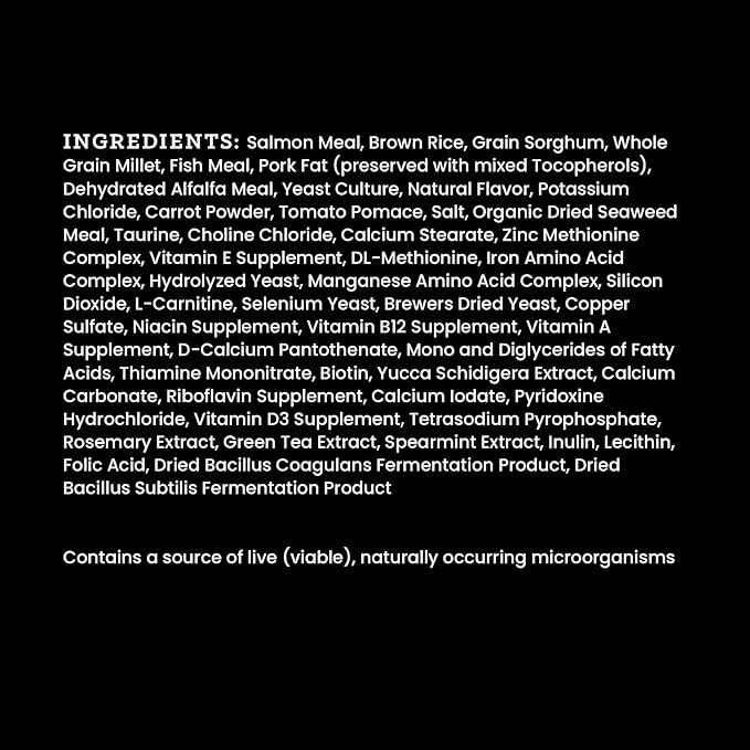 - QUALITY INGREDIENTS: High-quality salmon meal is the first ingredient in this nutrient dense recipe. With high amounts of animal protein, we proudly share the percentage of all protein sources on the front of our bag. The high-quality proteins in this recipe help build and maintain lean muscle, sustain energy and promote stamina for a full and healthy life.