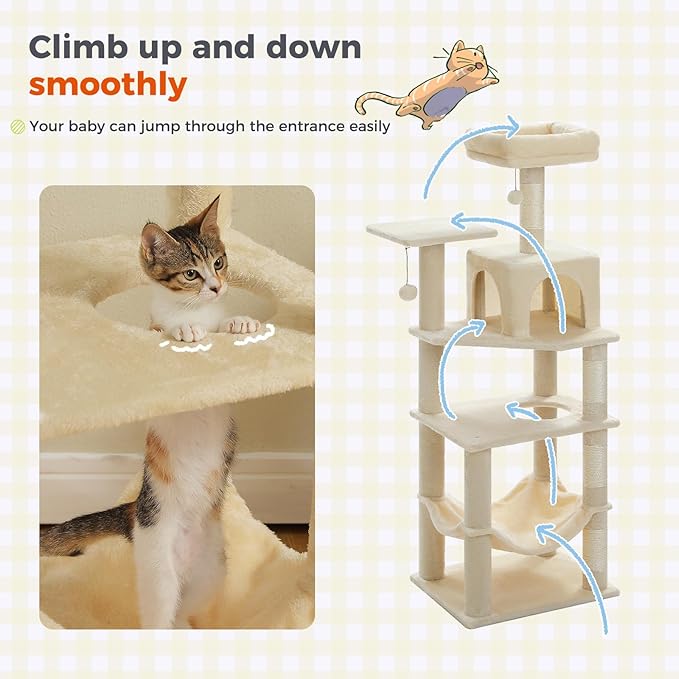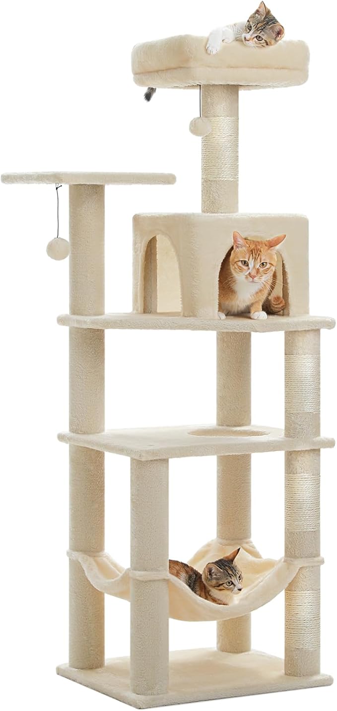 PEQULTI 56.3'' Cat Tree for Indoor Cats, Multi-Level Cat Tower with 2 Top Perch. Cat Condo, Hammock and Sisal-Covered Scratching Post, Beige