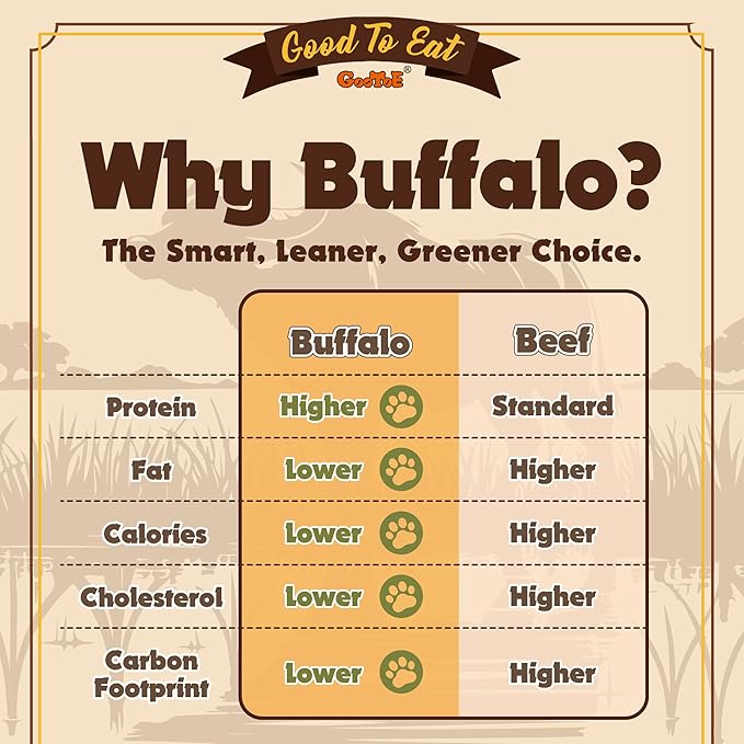 • Healthier & Tastier: Buffalo is a lean protein with less fat and fewer calories than beef, making it a nutritious choice for your dog. Naturally rich in essential nutrients and beneficial fatty acids, it supports a shiny coat, healthy skin, and overall well-being.