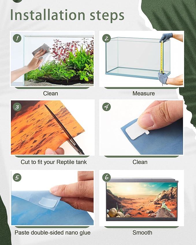 - Easy to Install and Adjust: this reptile tank background comes with a sufficient amount of glue, which can fixed on the back of the glass container without glue or other adhesives, which is convenient and quick; Our aquarium background uses a Polyester Material, which will not produce bubbles when pasted, and you can cut and adjust it according to the actual size of the reptile tank, Also means that you can change different backgrounds at any time